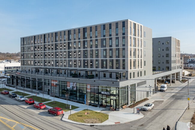 Experience luxury living at Medley, located in the heart of the innovation district in Cleveland, OH. Now leasing brand-new pet-friendly studio, one and two-bedroom apartments. Relax, rest, and rejuvenate in our well-equipped homes designed with quartz kitchen countertops, wood-inspired flooring, stainless steel appliances, modern two-tone cabinetry, in-home washer/dryer, and select apartments with a walk-in closet. Immediately adjacent to Cleveland Clinics main campus and near CWRU and University Hospitals, residents can explore, experience, and thrive with the best local dining and entertainment. Medley offers access to our 2nd-floor amenity deck, where residents can join, connect, and gather, and conveniences including a Fresh Market grocery store, a fitness center with free weights, an indoor lounge, and covered parking. There's so much more to learn about Medley, and our leasing team is ready to show you around. Schedule your personalized tour of the community! Medley is an apartment community located in Cuyahoga County and the 44106 ZIP Code. This area is served by the Cleveland Metropolitan attendance zone. Unique Features
