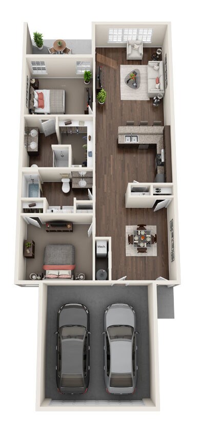 - Two-bedroom, two-bathroom floor plans
